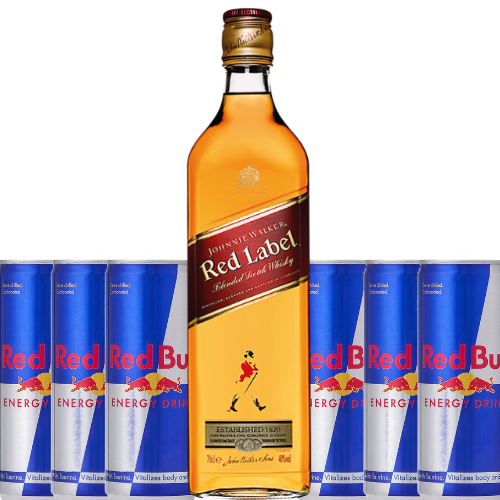 Acompanha 1 garrafa de Red Label e 6 unidades de Red Bull