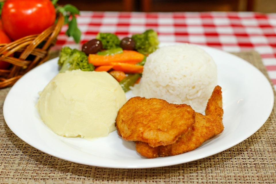Acompanha arroz, purê de batata e salada