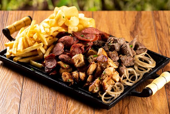 300g de frango a passarinho, 300g de lingüiça calabresa, 300g de contra filé, 300g de batata frita e 300g de mandioquinha